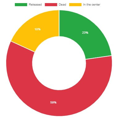Recibimos un promedio de 25-30 animales electrocutados por año, de los cuales logramos curar y recuperar el 30% (ver gráfico a continuación).